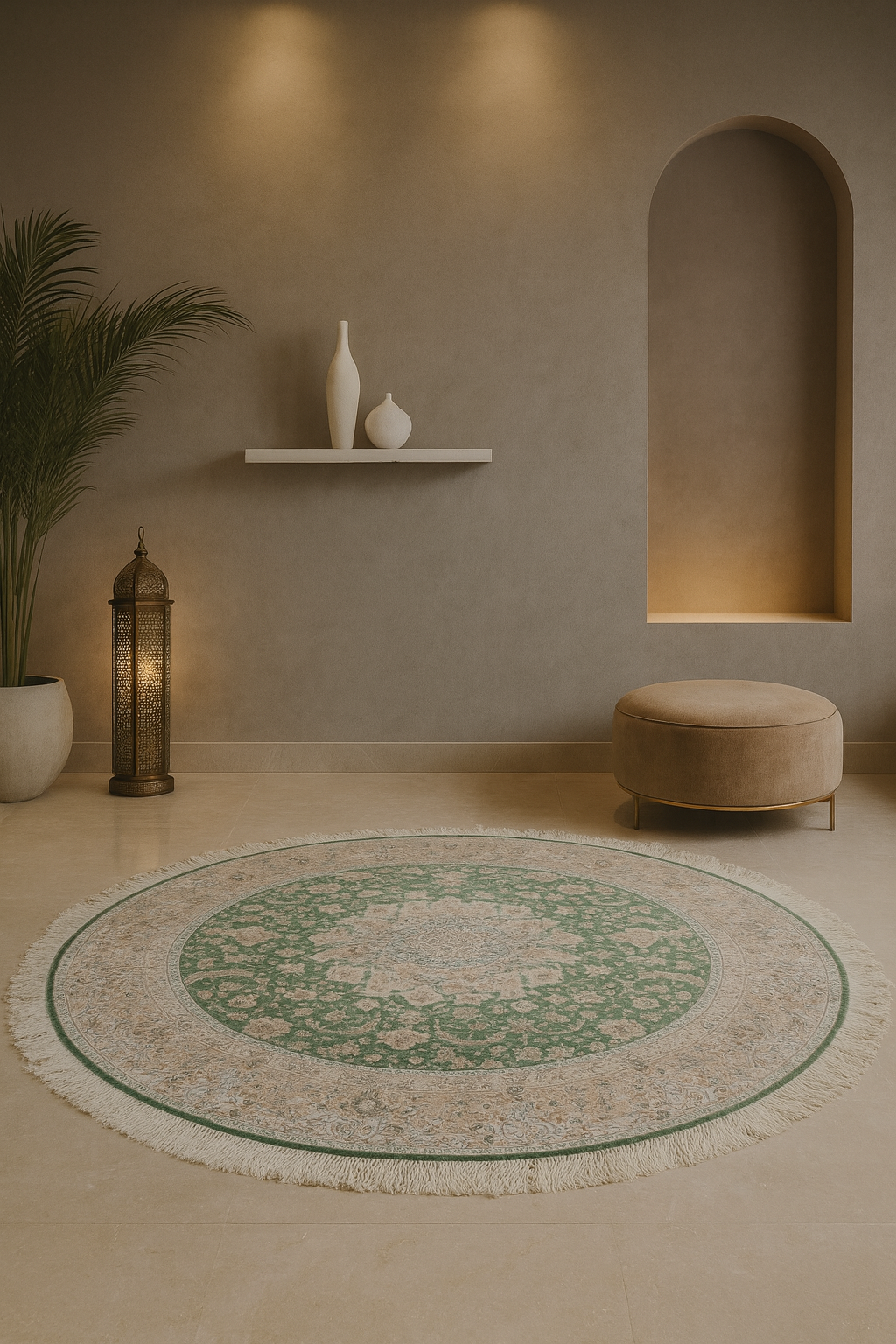 هذه القطعة الفاخرة، المنسوجة يدويًا في إيران بكثافة عقد دقيقة، مثالية للمجالس، وقاعات الاستقبال، وغرف الملابس، والمتاجر الراقية، والفلل، والمساحات المصممة للأناقة والتناغم . تصميمها الدائري يضفي جمالًا معماريًا فريدًا، مما يجعلها قطعة مركزية مميزة للديكورات الداخلية الراقية.