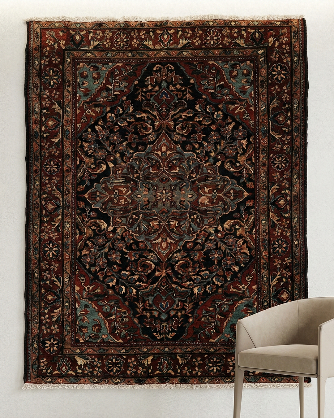 يحيط بالسجادة إطار مزخرف بنقوش غنية، يعكس الطابع الهندسي للجزء المركزي، ويضفي عليها توازناً وتناسقاً. بفضل جماليتها الحرفية المستوحاة من التراث، تُعد هذه السجادة مثالية لغرف المعيشة، أو غرف الدراسة، أو المساحات التي تتبنى الطراز الريفي، أو القبلي، أو الكلاسيكي.
