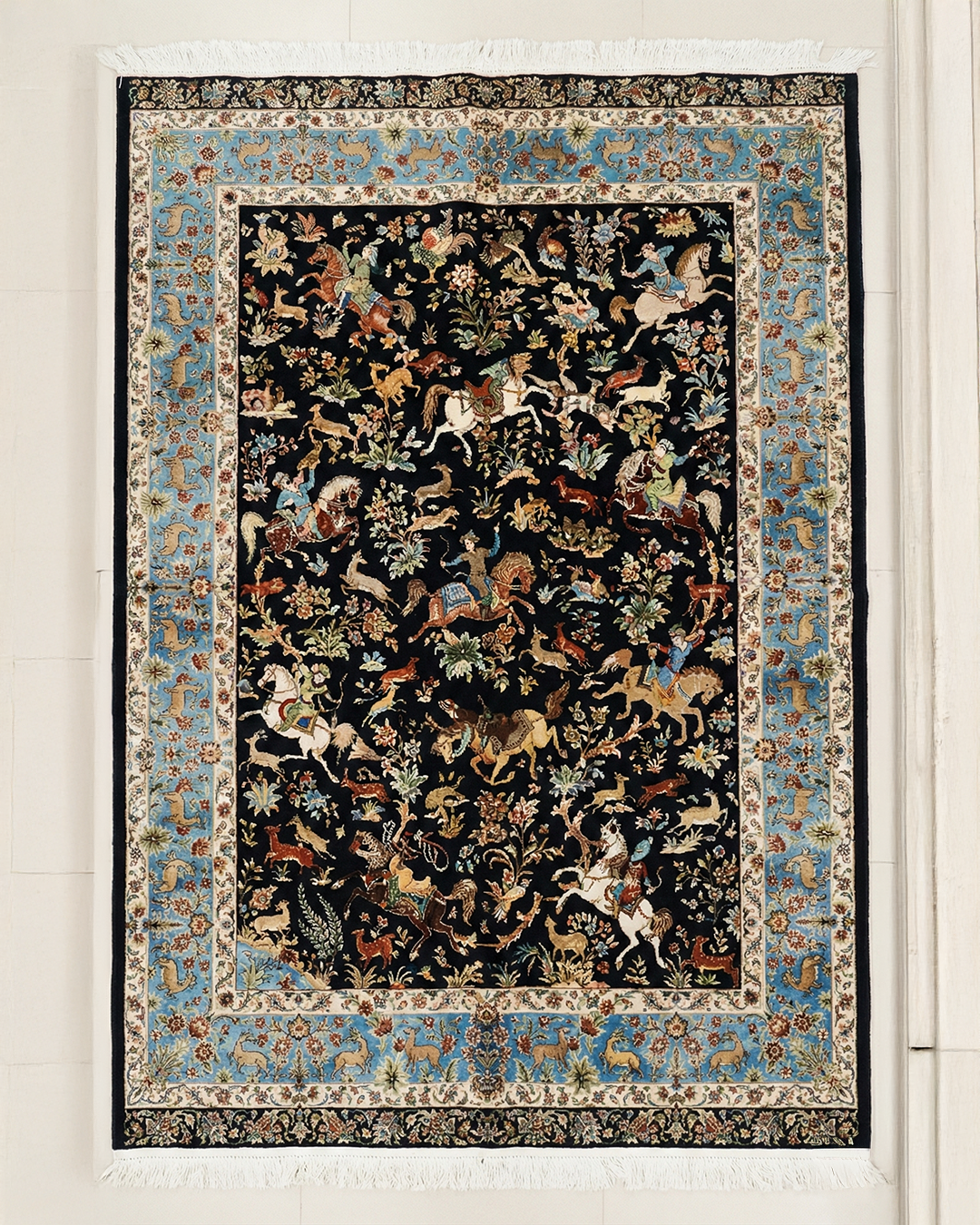 تُبرز هذه السجادة الفارسية الرائعة مشهد صيد مُتقن منسوج على خلفية سوداء داكنة، ما يعكس براعة فنية استثنائية وسردًا تاريخيًا ثريًا. وتُصوّر شخصيات نابضة بالحياة لفرسان على ظهور الخيل، وحيوانات برية، وعناصر نباتية مورقة بتفاصيل دقيقة، مُجسّدة بألوان متناغمة من العاجي، والبيج، والذهبي الدافئ، والصدأ الهادئ، والأخضر الزيتوني، والأزرق الفاتح، لتُشكّل لوحة فنية حيوية ومتوازنة في آن واحد.