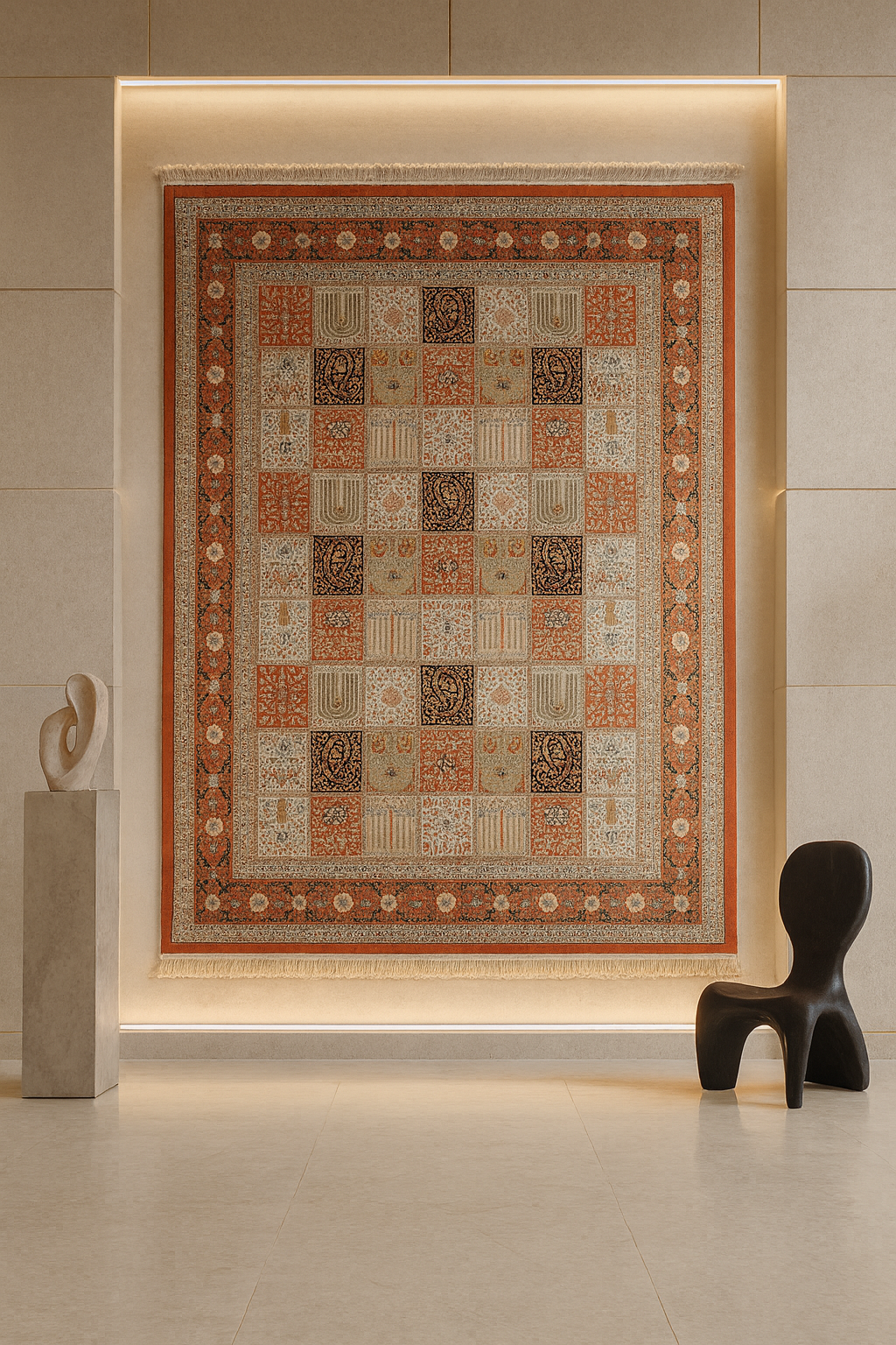 The balanced geometric layout makes this carpet a standout choice for modern interiors, majlis seating areas, living rooms, and luxury hallways. Its fine knotting, elegant fringes, and premium wool/silk blend (common in Persian panels) make it not only a statement piece, but a true collector’s rug.